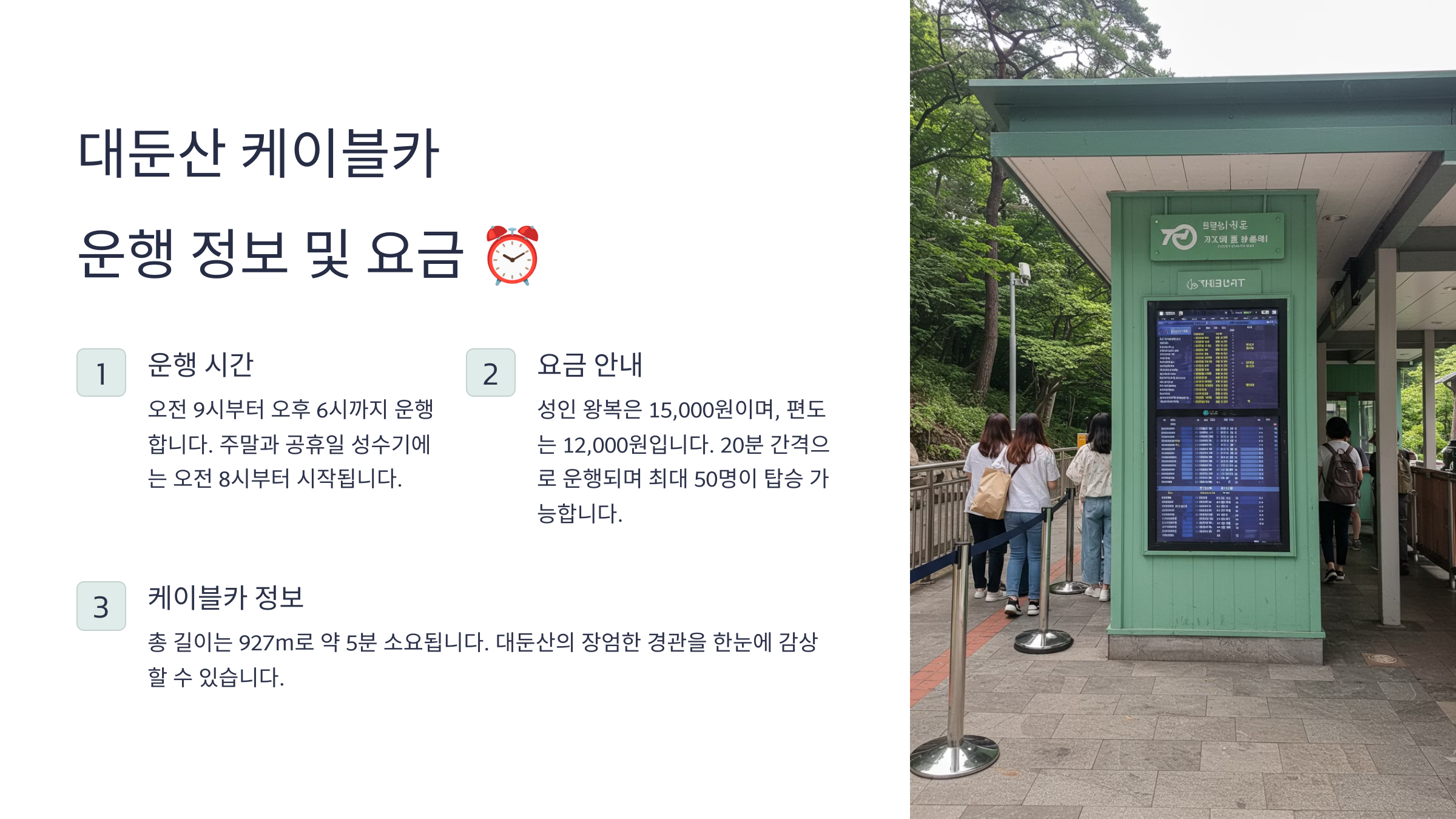 이 팁들만 잘 기억하면 보다 편하게 대둔산 케이블카를 이용할 수 있어요. 좋은 날씨에 방문해서 최고의 풍경을 감상해 보세요! 🚠
