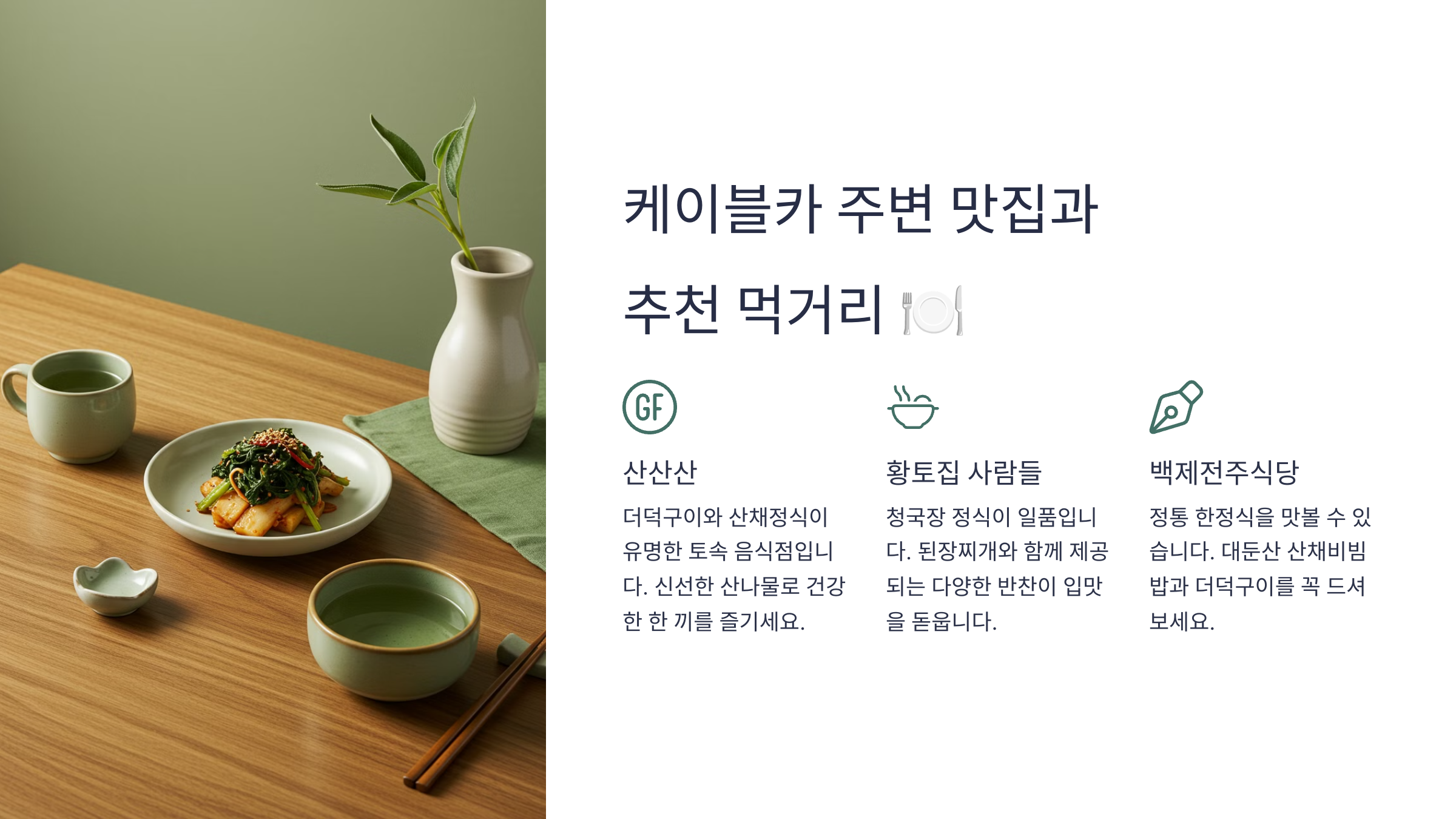 대둔산을 여행할 때 빠질 수 없는 것이 바로 맛있는 먹거리죠! 케이블카 근처에는 등산 후 허기진 배를 채울 수 있는 맛집이 많아요. 전통 한식부터 푸짐한 산채정식, 별미 막걸리까지 다양한 음식을 즐길 수 있어요.