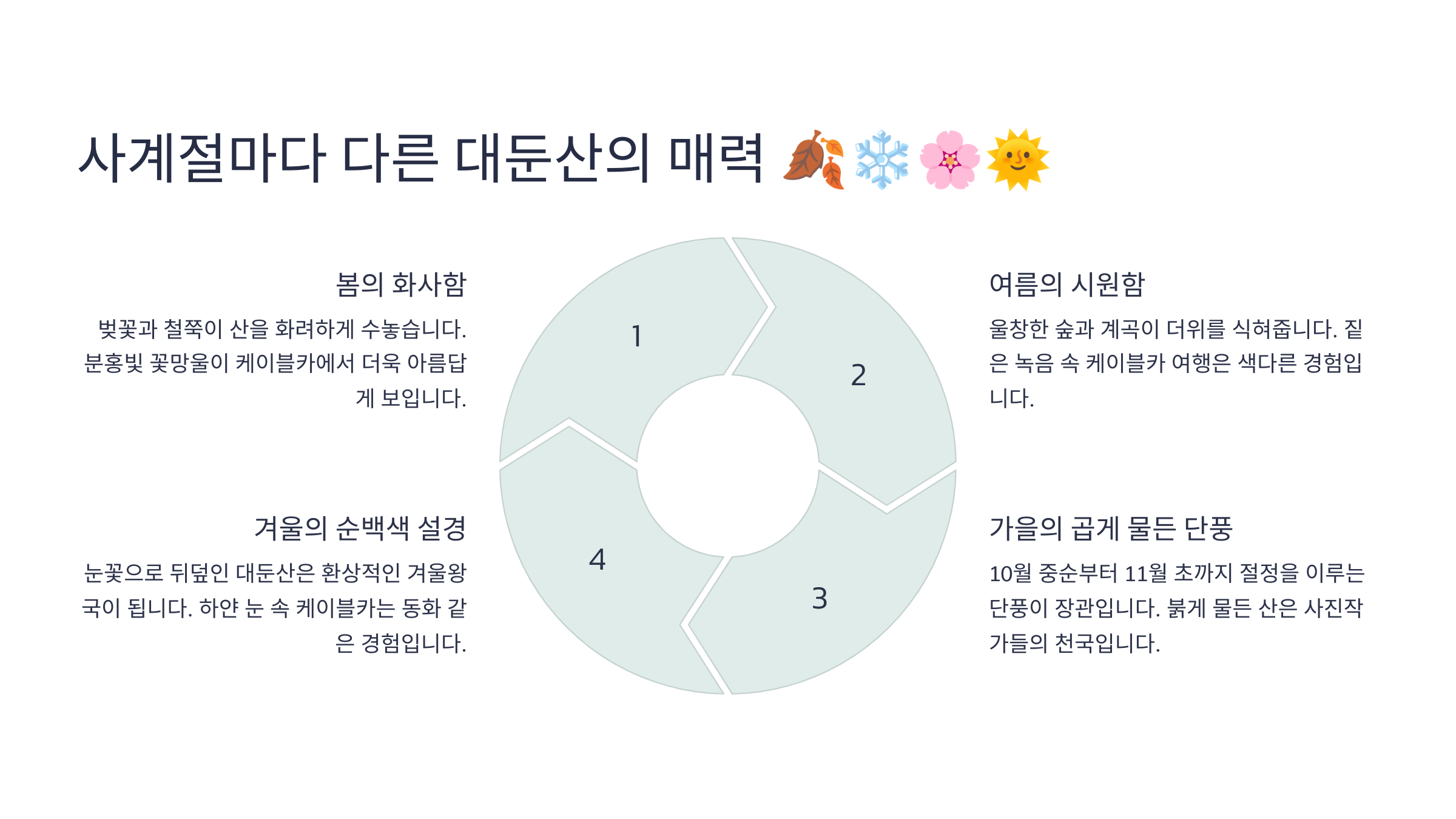 대둔산은 계절마다 완전히 다른 풍경을 보여줘요. 봄에는 화사한 벚꽃과 신록, 여름에는 울창한 녹음, 가을에는 단풍 절경, 겨울에는 하얀 설경이 펼쳐져요. 어느 계절에 가도 감탄할 만한 경치를 감상할 수 있답니다. 🍁❄🌸🌞
