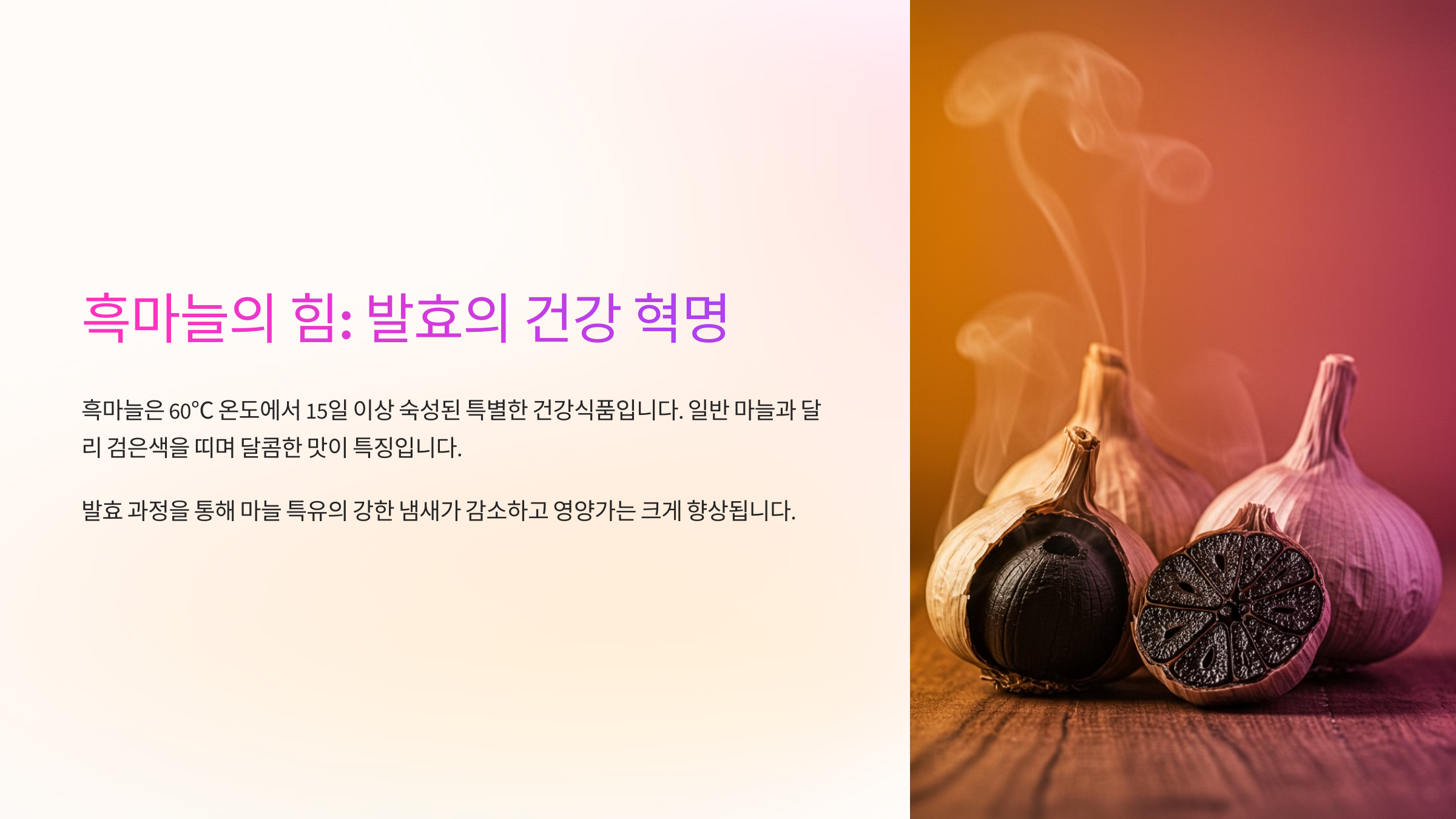 이처럼 흑마늘은 발효 과정을 거치면서 영양소가 더욱 풍부해지고, 우리 몸에 흡수되기 쉬운 형태로 변하게 돼요. 특히, 매일 섭취하면 면역력 강화와 피로 회복에 탁월한 효과를 볼 수 있답니다! 😃