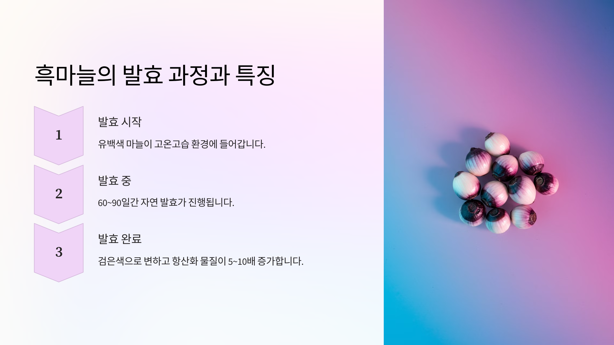 흑마늘은 일반 마늘을 60~90℃의 온도와 80~90%의 습도에서 약 2~3주 동안 숙성시켜 만든 발효 식품이에요. 이 과정에서 마늘 속 유효 성분이 증가하고, 항산화력이 10배 이상 강해진다고 알려져 있어요.