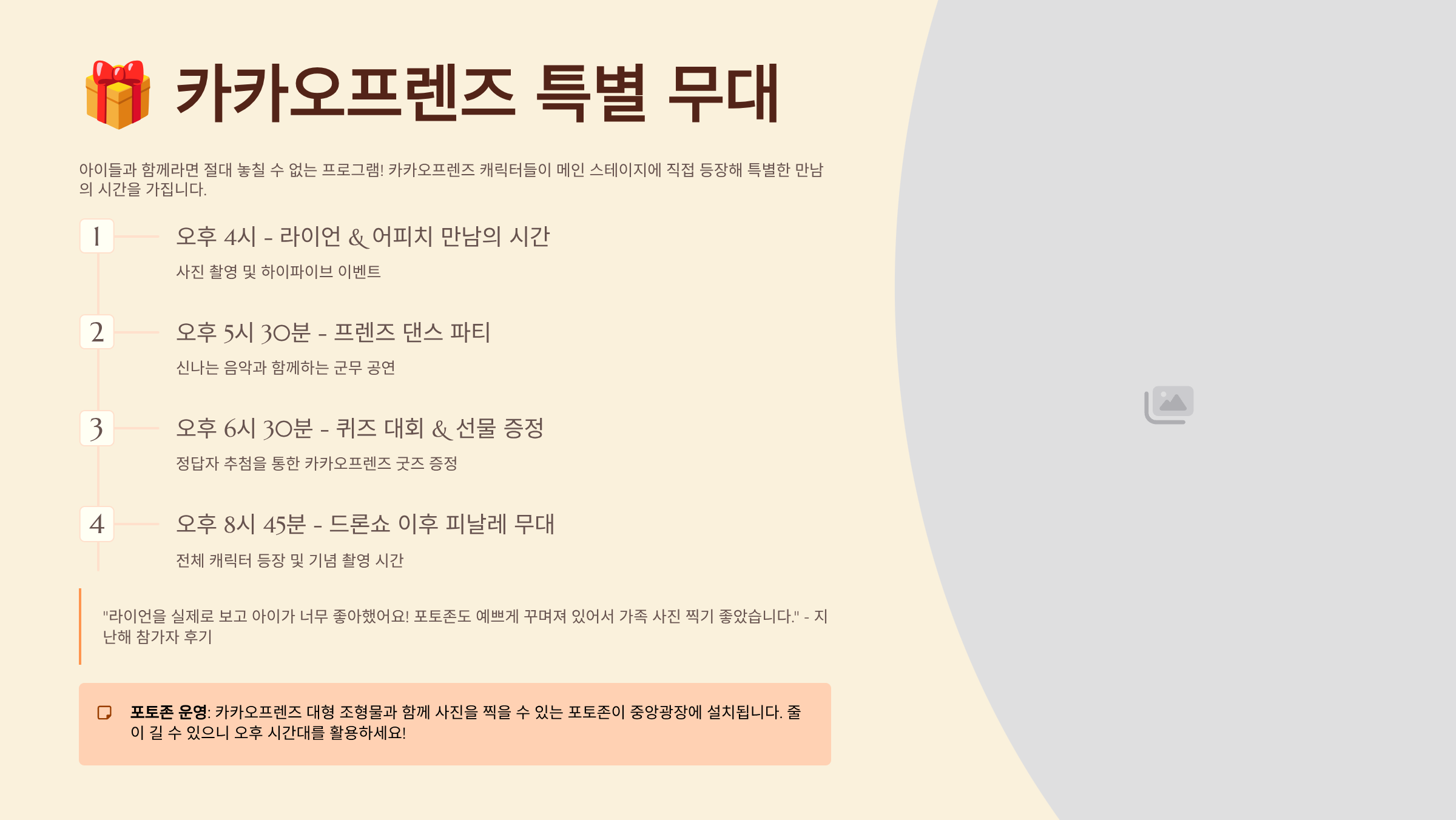 이번 피날레 공연의 하이라이트는 바로 카카오프렌즈 스페셜 연출이에요! 드론으로 구현되는 라이언, 어피치, 무지 캐릭터들의 하늘 위 댄스 공연은 가족 관객들에게 최고의 추억이 될 거예요.
