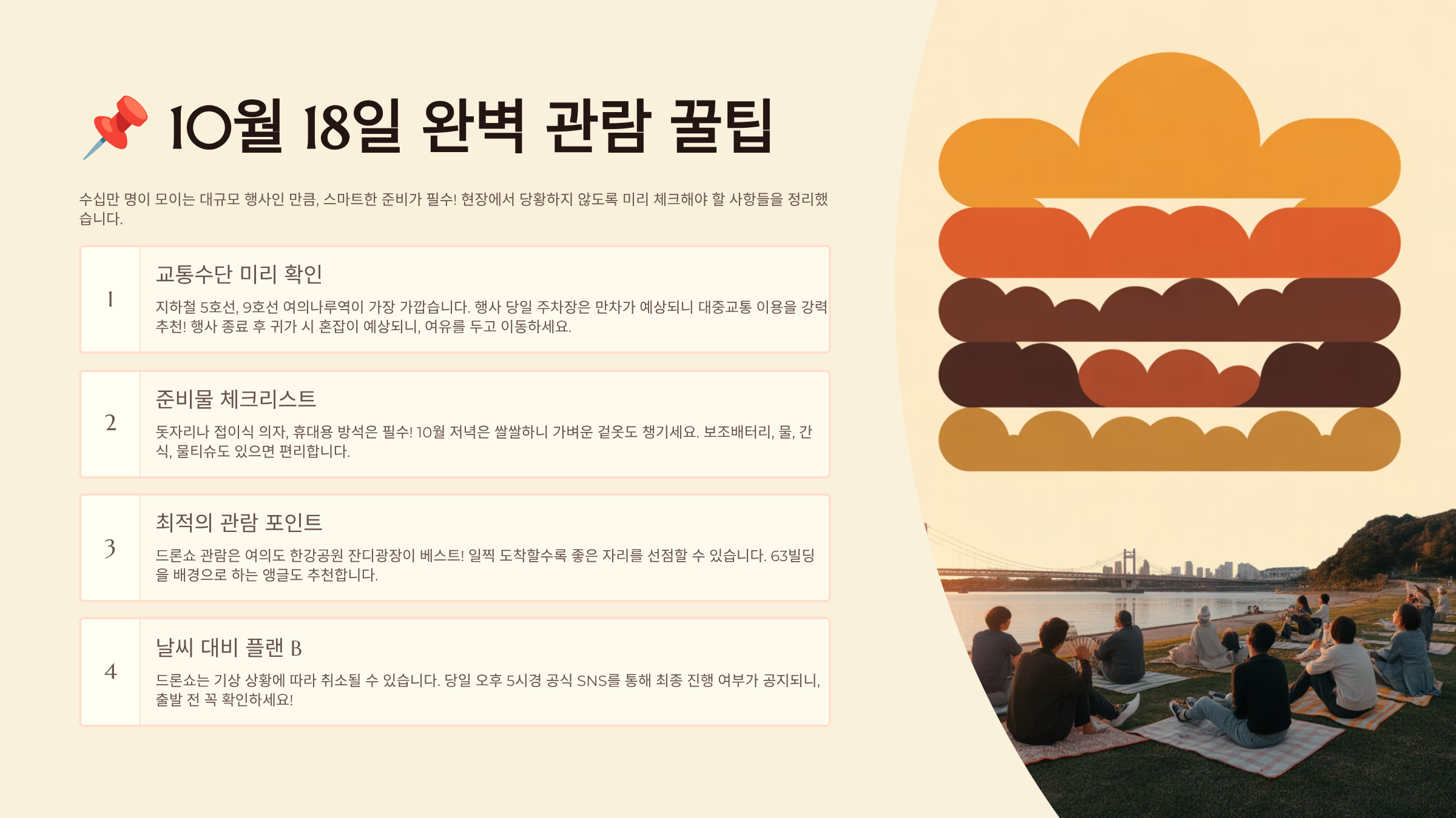A4. 기상 상황에 따라 연기 또는 취소될 수 있으므로, 당일 서울시 공식 SNS를 꼭 확인하세요.