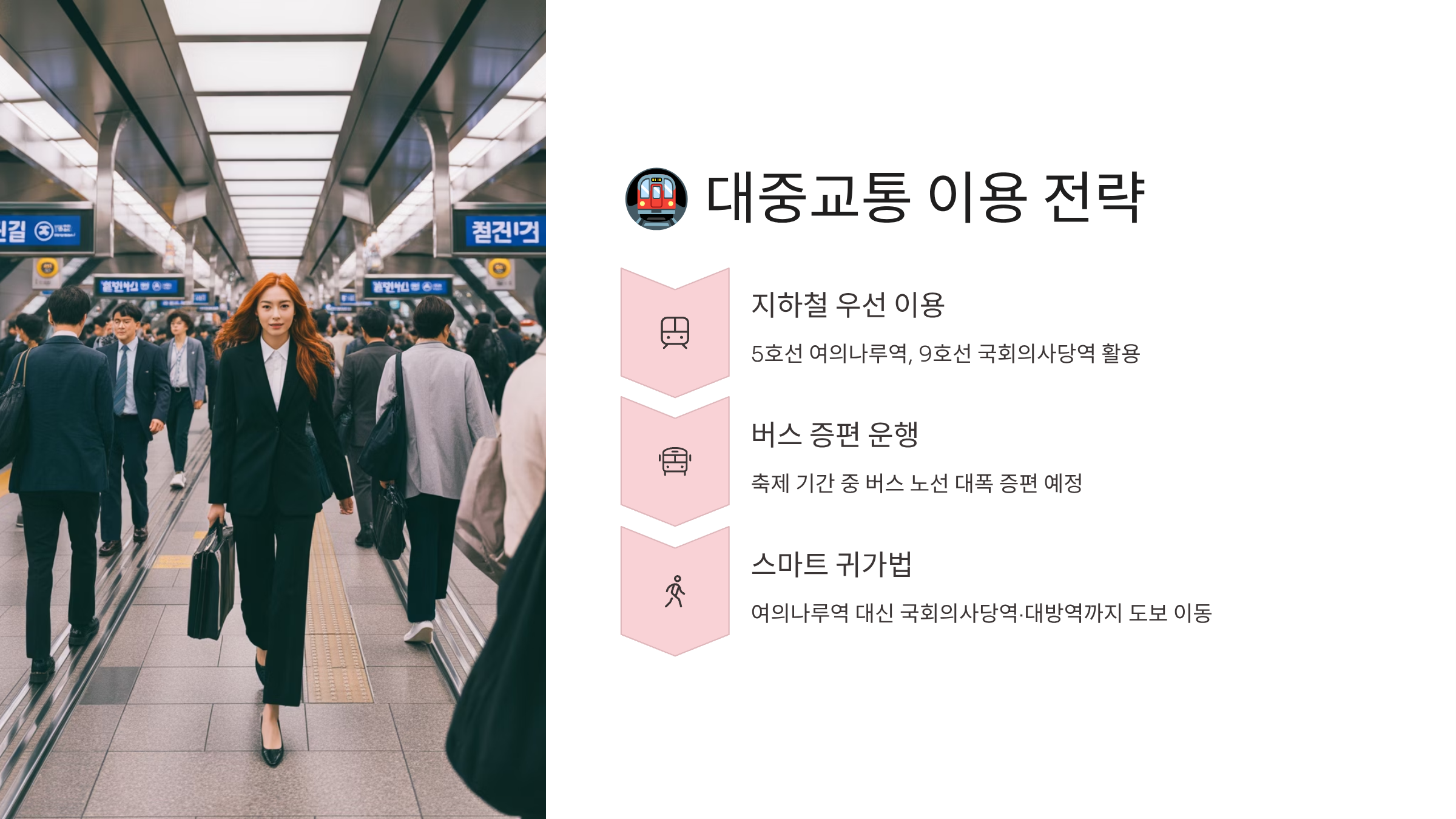 귀가 시에는 '한 정거장 걷기 전략'이 아주 효과적이에요. 예를 들어 여의나루역 대신 국회의사당역이나 대방역까지 도보로 이동 후 지하철을 이용하면 훨씬 수월하게 이동할 수 있어요.