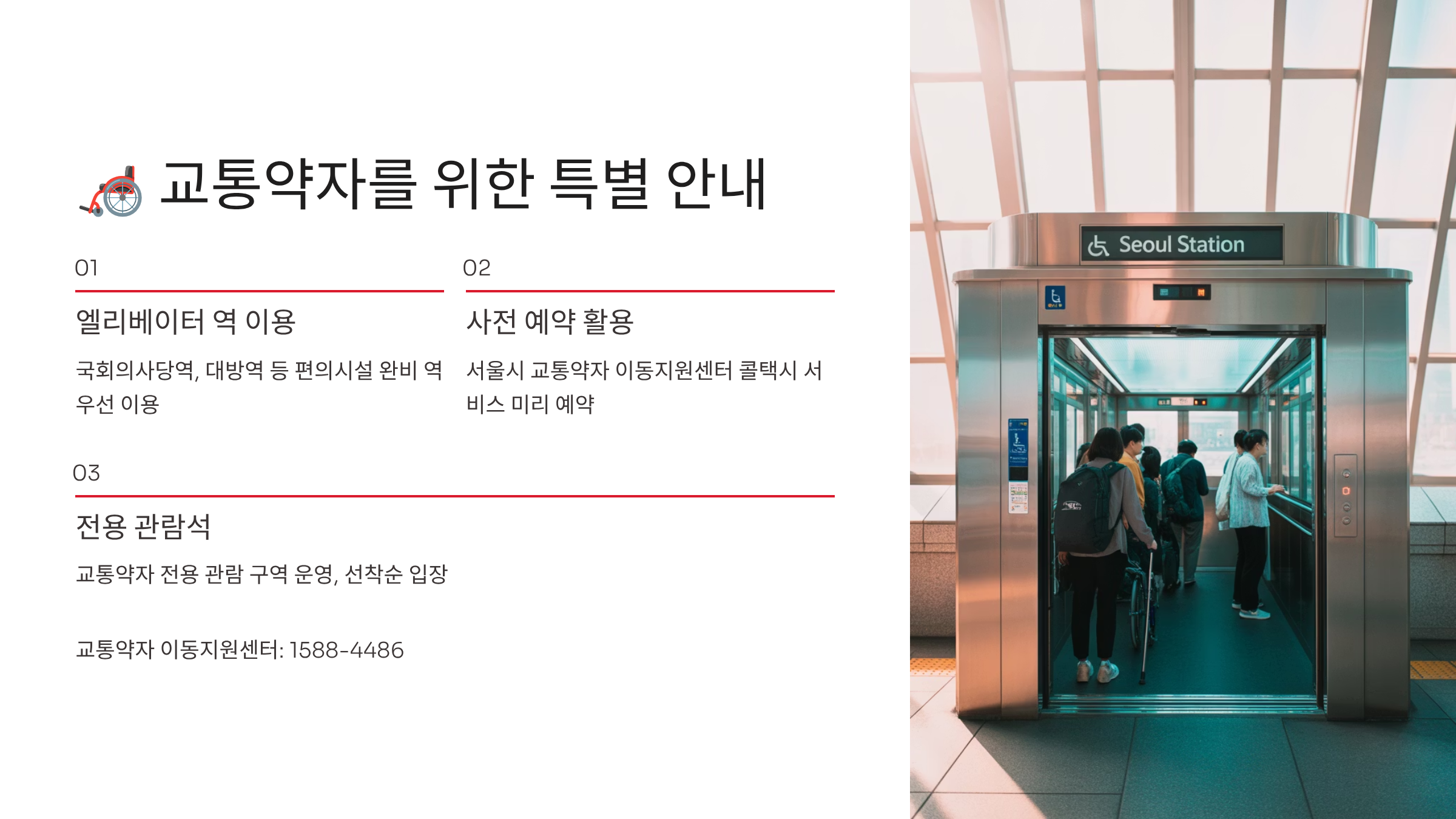 지하철역 중 엘리베이터가 설치된 역(여의도역, 국회의사당역 등)을 중심으로 동선을 잡는 것이 중요해요. 또한, 서울시 교통약자 이동지원센터 차량을 사전 예약해 이동하면 보다 편하게 이동할 수 있어요.