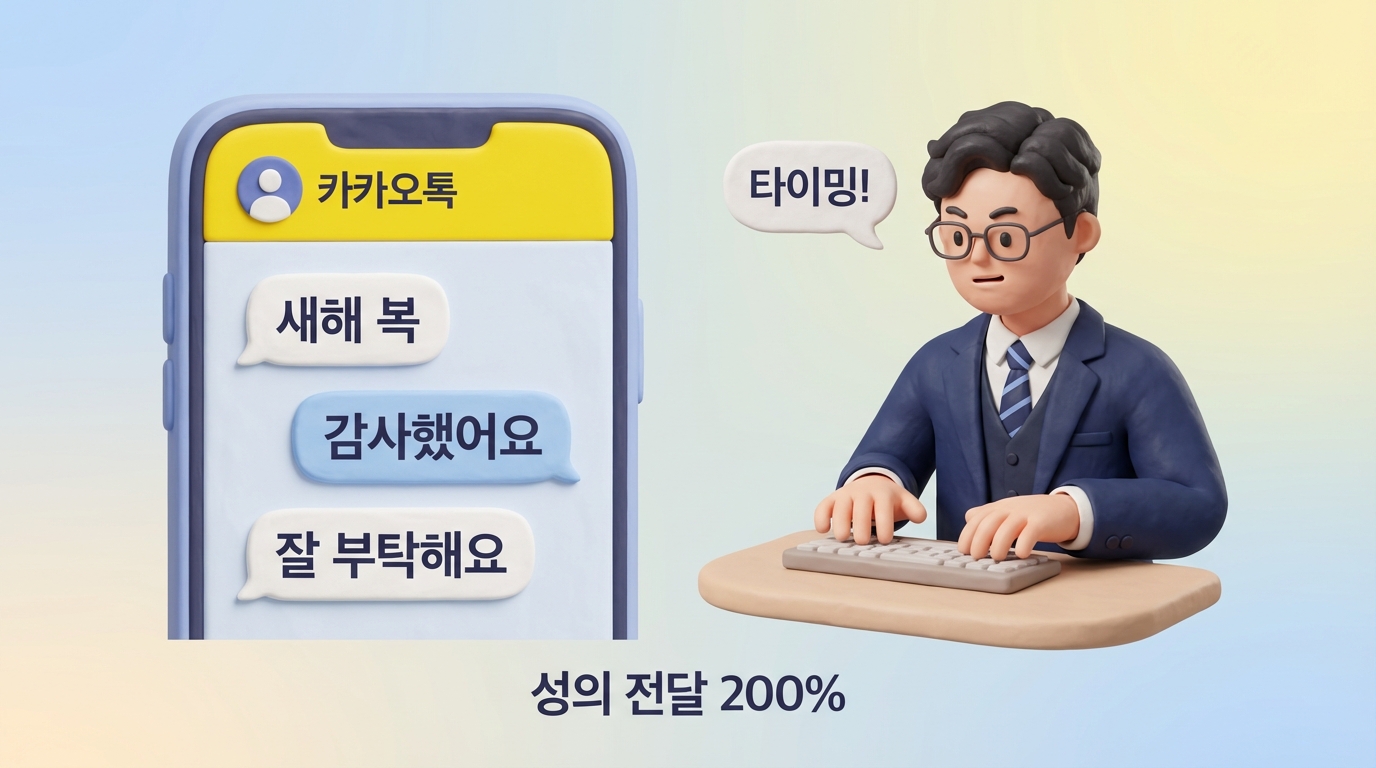 A: 짧고 간결하게! "여러분 모두 새해 복 많이 받으세요! 🎉" 정도면 충분해요. 개인 맞춤 메시지는 단톡방이 아니라 개인 톡으로 따로 보내는 게 좋아요.