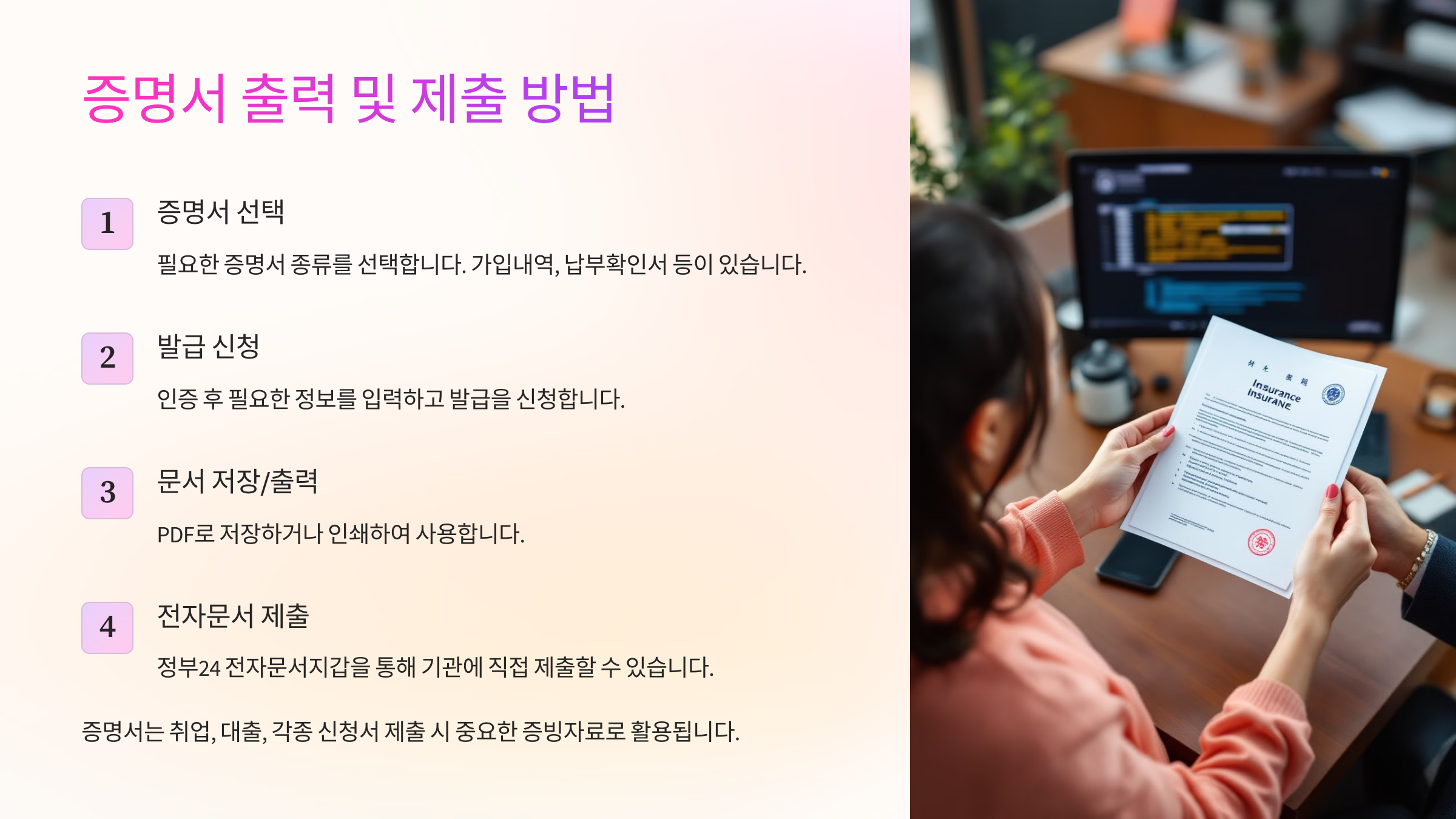 4대보험 가입내역을 확인했다면, 이제는 증명서 출력 또는 PDF 저장으로 제출 준비까지 마무리해야겠죠? 서류는 가입내역 확인서 또는 자격득실 확인서 형태로 출력할 수 있고, 대부분 공공기관이나 은행에서 그대로 인정돼요. 🧾