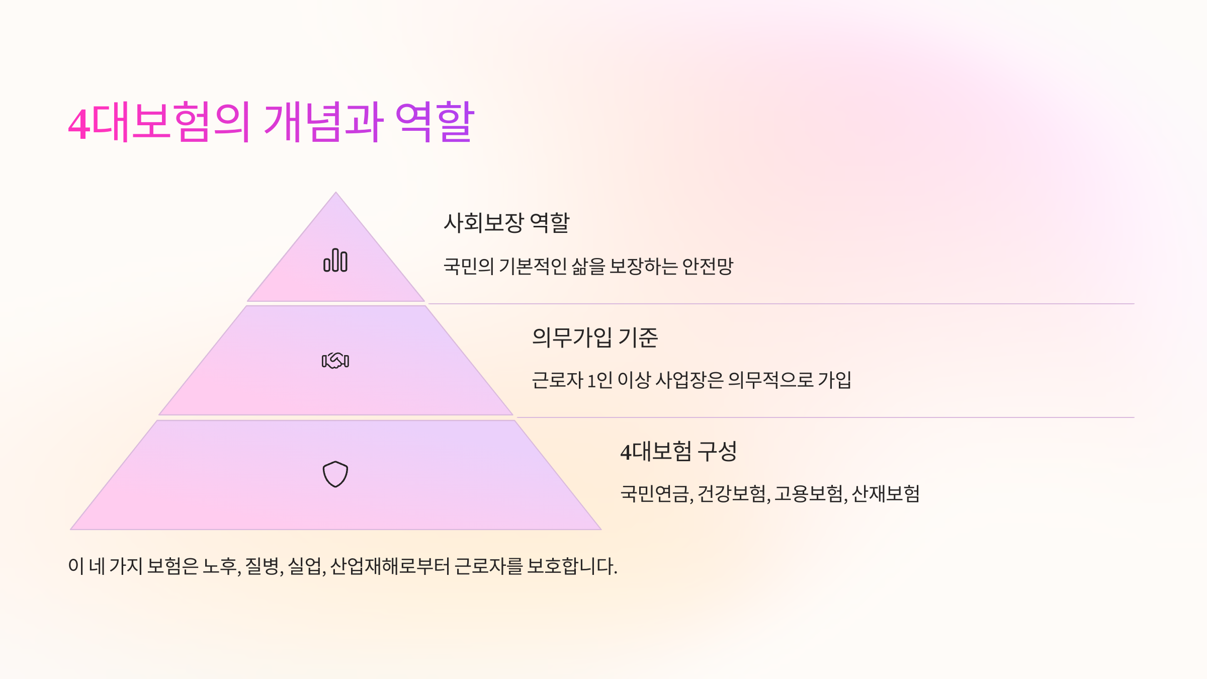 국민연금, 건강보험, 고용보험, 산재보험! 네 가지를 묶어 '4대보험'이라고 부르죠. 이건 고용형태와 상관없이 대부분의 직장인이 자동 가입되는 구조예요. 😊