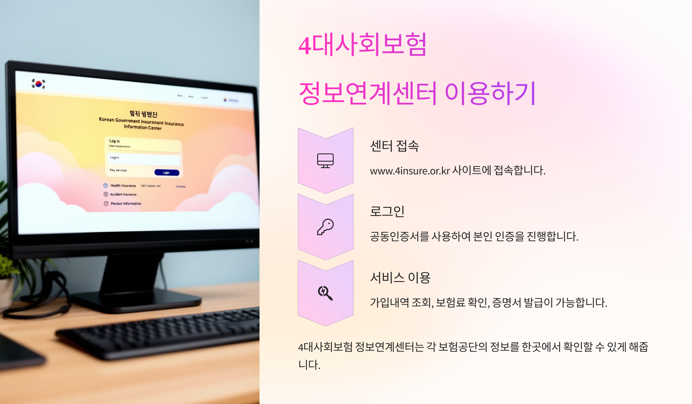 이 4대보험은 각 기관이 다르기 때문에 따로따로 조회하면 불편한데, 4대사회보험 정보연계센터에서 한 번에 통합 조회가 가능해졌답니다. 완전 필수 꿀사이트예요! 💯